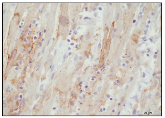 PD-L1 expression in the damaged areas was focally expressed in the cytoplasmic membrane of myocardiocytes (40 HPF).