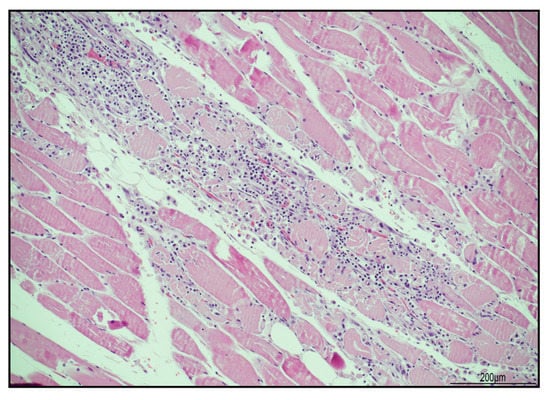 Histologically, in our case we found evidence of lympho-histiocytic myocarditis and necrotizing myositis, but other organs were not affected.