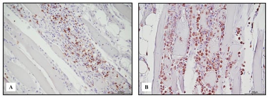 Immunohistochemical features of necrotizing myositis. Abundance of TCD3+ lymphocytes ((A) 10 HPF) and CD68 PGM1+ macrophages ((B) 20 HPF).