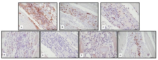 Immunohistochemical characterization of the lymphocytic inflammatory response in necrotizing myositis. TCD4+ cells ((A) 20 HPF) presented a cross reaction with macrophages, and lymphocytes were the darker brown. TCD4+ cells and TCD8+ ((B) 20 HPF) were in a similar ratio. TCD8+ cytotoxic cells were Tia-1+ ((C) 40 HPF) and PD-1+ ((D) 40 HPF), but Granzyme B negative ((E) 40 HPF). TCD25+ regulatory T cells were almost absent ((F) 40 HPF), associated with abundant BCD20+ lymphocytes ((G) 20 HPF). Scale bar: 200 μm.