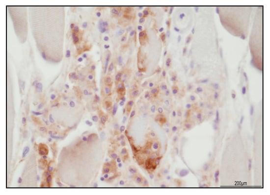 The sample from the iliopsoas muscle displayed necrotizing myositis characterized by TCD3+ lymphocytes and CD68 PGM1+ macrophages (Figure 6). The TCD4+ and TCD8+ cells were in a similar ratio; TCD8 expressed Tia-1 and PD1, but Granzyme B was negative. TCD25+ lymphocytes were negative, but BCD20+ lymphocytes were abundant (Figure 7). PD-L1 was focally recognizable in the injured myocytes and within the macrophages (Figure 8).
