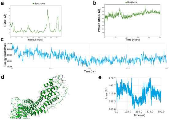 The optimized model was inserted into an orthorhombic water box containing salt to neutralize charges, and the pH was set to 7.4 using Maestro—Desmond software (DESMOND: Schrödinger Release 2022-1 version 13.1, Schrödinger, LLC, New York, NY, USA, 2021). The system was subjected to an initial minimization protocol. During this process, the system stabilized temperature and pressure. Once the system had been minimized and equilibrated at a temperature of 310 K with pressure of 1 atm, the system proceeded with the molecular dynamics production. The simulation was conducted for 500 ns using OPLS4 Force Field and TIP3P water model. Nose-Hoover chain Thermosat with relaxation time of 1 ps was set. The Barostat chosen was the Martyna-Tobias-Klein with a relaxation time of 2 ps and an isotropic coupling. The simulation starting point was set with a random seed.