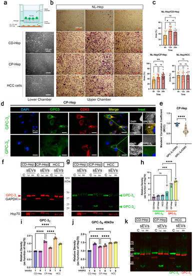 To study the effects of CD-, CP- and HCC hepatocyte-secreted components in normal (NL) hepatocytes (Hep), which are not migratory cells, we implemented a no-contact co- culture utilizing a multichambered system (graphically represented in Figure 2a). Normal hepatocytes were plated in the upper chamber coated with Matrigel, and CD-, CP- and HCC hepatocytes were plated in the lower chamber. Representative phase contrast images of the lower chamber (left column) and Matrigel chamber (upper chamber) with migrating hepatocytes revealed cells migrating through the Matrigel (Figure 2b). Quantification of the area (expressed in % of covered area by migrating cells) covered by migrating cells in NL-Hep/CD-Hep, NL-Hep/CP-Hep and NL-Hep/HCC systems suggested that the materials exchanged between the chambers induce migration of normal hepatocytes (Figure 2c). In particular, we observed a significant increase in the number of migrating NL-Hep induced by CD-Hep at 12 h and CP-Hep at 24 h. This observation, alongside our previous studies on CP-Hep as pre-cancerous cells, sets our experimental plan focusing on CP-Hep. Immunofluorescence assay in CP-Hep was performed to show the cellular distribution of GPC-3 C-terminal (GPC-3C) and N-terminal domains (GPC-3N). To evaluate co-occurrence of GPC-3 domains in CD63 positive small EVs we measure Manders’ colocalization coefficient (MCC). While the GPC-3N is detected in the cytosol and membrane of hepatocytes (Figure 2d) with a partial overlapping with CD63 (enriched in cellular vesicles) in the central region of the cells, GPC-3C shows a higher co-localization and MCC with CD63 compared to GPC-3N (Figure 2e). Moreover, GPC-3C showed minimal reactivity in the cytosol and cellular membrane. Co-localization with CD63, an EVs marker, also revealed that not all CD63 positive sEVs contained GPC-3C (Figure 2d,e). To confirm our IF observations, we performed Western blotting analysis of cytoplasmic and sEV associated content of GPC-3 domains. We observed GPC-3N in the cytosol extract with a lower level of another form modified by a post-translational event in the sEVs (Figure 2g). Another form of GPC-3 between 20–25 kDa is detected in initial stages of culture EVs and disappears in late stages. In Figure 2f we observed that GPC-3C is, as confirmed by immunofluorescence, unique to small EVs and is entirely absent from the cytosol. This form is maintained over time and shows a lower molecular weight than GPC-3N. To show the purity of the extraction, GAPDH was used as a control for the cytosolic extract and Hsp70 for the small EVs isolated extract. Densitometry analysis as a function of Hsp70 showed higher levels of GPC-3N in HCC sEVs (Figure 2h). GPC-3C densitometry at early (1 week) and late (8 weeks) passages showed higher levels in Cp-Hep and HCC small EVs (Figure 2i,j) We know that GPC-3 is cleaved by Furin-Convertase, and that the domains are still associated by disulfide bindings [32]. However, in the small EVs, GPC-3C expression is higher than GPC-3N, which suggests that the C domain is the main form of GPC-3 in secreted sEVs from PHH. In Figure 2k is represented the merged membrane of immunoblots represented in Figure 2f,g.