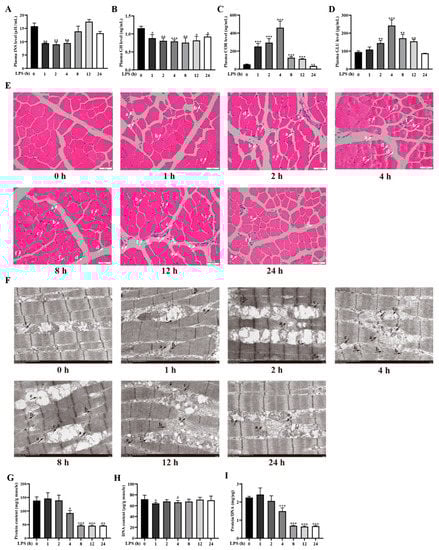 Using LPS-stimulated piglets to establish the model of cachexia, we quantified the concentrations of plasma markers of cachexia, such as INS, GH, COR, and GLU []. Various reports have revealed that hormone secretion disorder can be triggered by LPS challenge, specifically manifested as reduced plasma INS and GH concentrations [,], and increased plasma COR and GLU concentrations [,]. These changes are highly consistent with the physiological changes of cachexia patients. We found that the levels of INS and GH were significantly diminished at 1 h after LPS injection and the concentrations of COR and GLU were dramatically increased at 2–12 h after LPS challenge. In agreement with previously published results of cachexia patients and organisms [,,], the INS and GH levels and the COR and GLU levels were decreased and increased, respectively. Since severe muscle mass loss and protein degradation are manifested in cachexia patients [], we first explored the dynamic effect of the LPS challenge on muscle damage by observing the morphology and ultrastructure of muscle. As expected, injection of LPS at different time points (1, 2, 4, 8, 12, and 24 h) induced different degrees of muscle injury. We further explored the dynamic effect of the contents of protein and DNA and the ratio of protein/DNA in longissimus dorsi muscle by LPS challenge. The protein/DNA ratio is an effective indicator of muscle protein mass []. Our results demonstrated that the content of protein and the ratio of protein/DNA decreased after LPS injection 4–24 h. In agreement with our results, Liu et al. [] showed that the ratio of protein/DNA was diminished in the longissimus dorsi muscle and gastrocnemius muscle at 4 h after LPS injection. These results indicate that LPS dynamically changes physiological and biochemical indexes for the diagnosis of cachexia in weanling pigs.