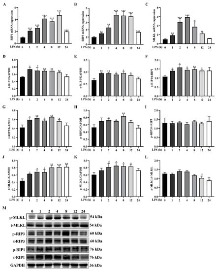 To confirm the involvement of necroptosis in LPS-induced muscle protein degradation, we assessed the mRNA and protein levels of RIP1, RIP3, and MLKL, which are considered to be key signals of necroptosis []. Compared to the control group, LPS upregulated the mRNA expression of RIP1 between 1–24 h (peaked at 12 h), RIP3 between 1–24 h (peaked at 4 h), and MLKL between 1–12 h (peaked at 4 h) (p < 0.05) (Figure 3A–C). The protein abundances of t-RIP1 between 1–12 h, p-RIP1 between 1–12 h, t-RIP3 between 1–12 h, p-RIP3 between 2–8 h, t-MLKL between 1–24 h, and p-MLKL between 4–12 h were significantly elevated (p < 0.05). The ratios of p-RIP1/t-RIP1 between 1–12 h and p-MLKL/t-MLKL at 24 h were also significantly increased (p < 0.05) (Figure 3D–M).