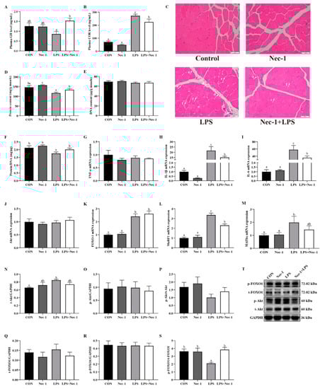 We further investigated whether inhibition of necroptosis attenuated inflammatory response and muscle protein degradation. LPS challenge at 4 h upregulated the mRNA expression of IL-1β and IL-6 (p < 0.05). As expected, Nec-1 alleviated the increase of IL-1β and IL-6 mRNA abundance induced by the LPS challenge (p < 0.05) (Figure 5G–I). In addition, LPS treatment at 4 h elevated MuRF1 and MAFbx mRNA abundance but were alleviated by Nec-1 pretreatment (p < 0.05) (Figure 5K–M). Nec-1 pretreatment restored the reduction of the ratio of p-FOXO1/t-FOXO1 to the normal level (p < 0.05) (Figure 5N–T).