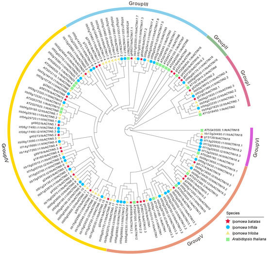 2.2. Phylogenetic Relationships of ACTINs in the Sweet Potato and Its Two Diploid Relatives