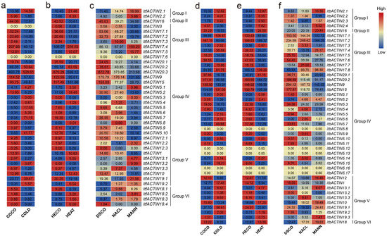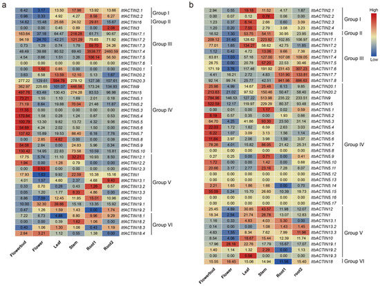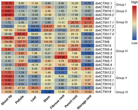 2.6. Expression Analysis of ACTINs in the Sweet Potato and Its Two Diploid Relatives