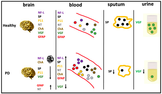 Brain-biomarker changes in bodily fluids of PD patients. Figure legend: The figure shows proteins that change in the brain (nigrostriatal areas) and bodily fluids (plasma, saliva, and urine) of PD patients. NF-L and ChA were found to be abnormally aggregated in the brain and increased in the blood. SP and P11 decreased in the brain (and SP also decreased in sputum), but increased in the blood, while GFAP and NT increased in both the brain and blood. In contrast, VGF decreased in the brain, but also in blood and urine. NF-L: neurofilament light protein; SP: substance P; P11: S100A10 (S100 calcium-binding protein A10); NT: neurotensin; ChA: Chromogranin A; VGF: no acronym; GFAP: glial fibrillary acidic protein. Upward arrow: increase; downward arrow: decrease.