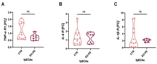 Cytokine receptors in CTR and EO-PE. Expression of TNF-α (A), IL-6 (B) and IL-1β (C) receptors was quantified with RT-qPCR and compared between CTR and EO-PE fpECAs. No significant difference was noted in any of them between the two sets of samples. FC of each gene was presented as a violin plot with all individual samples. Mann–Whitney test was used for comparison. Dashed lines represent median, while dotted represent quartiles. CTR N = 13, EO-PE N = 6–7. ns = not significant. RT-qPCR, quantitative reverse transcription PCR; fpECAs, feto-placental endothelial cells isolated from arteries; R, receptor; TNF-α, tumor necrosis factor α; IL, interleukin; FC, fold change.