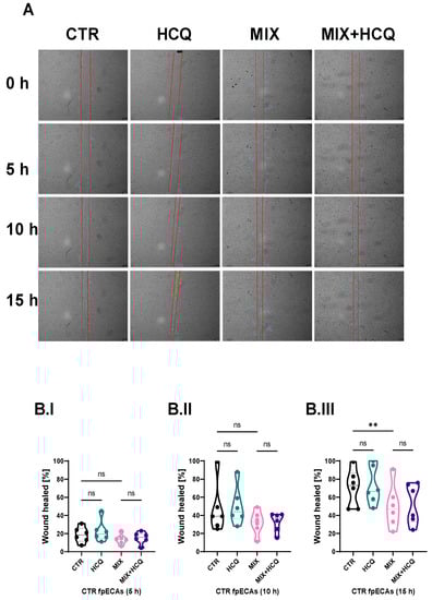 Wound healing assay. (A) Microscopic visualization of wound healing of one representative experiment (out of six biological repetitions) under all conditions at 0, 5, 10 and 15 h time points. Original magnification is 10×. (B.I–B.III) Statistical assessment of differences between CTR and HCQ, CTR and MIX, CTR and MIX+HCQ, and MIX and MIX+HCQ at three specific time points (5, 10 and 15 h; Quantification of wound healing was carried out using ImageJ V 1.43l software. Scratch areas of all conditions at time points 5, 10 and 15 h was normalized to respectful scratch area at time point 0 h. Repeated measurements (RM) one-way ANOVA with Sidak’s post hoc test was used to determine the significance at 5 and 15 h; Friedman test with Dunn’s post hoc was used for the 10 h time point. N = 6; ** p ≤ 0.01; ns, not significant. Scale bar = 200 µm; 1 µg/mL of HCQ was tested. h, hours; HCQ, hydroxychloroquine; MIX, cytokine mix composed of TNF-α, IL-6 and IL-1β.