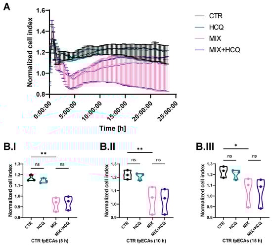 Endothelial barrier assay. (A) Real-time impedance measurement of endothelial barrier integrity after treatment with HCQ, MIX or combined treatment over time of CTR fpECAs from three independent experiments. Disruption of endothelial barrier was observed after challenge with MIX. (B.I–B.III) After quantification of cell index for specific time points, MIX treatment showed the strongest effect at 5 h (B.I), and a slow recovery over 10 h (B.II) and 15 h (B.III) of MIX-treated cells was detectable. Moreover, 1 µg/mL HCQ neither improved nor impaired endothelial barrier stability. Statistical analysis of differences between four conditions at specific time points (5, 10 and 15 h) was conducted with paired RM one-way ANOVA. N = 3; * p ≤ 0.05; ** p ≤ 0.01; ns, not significant.
