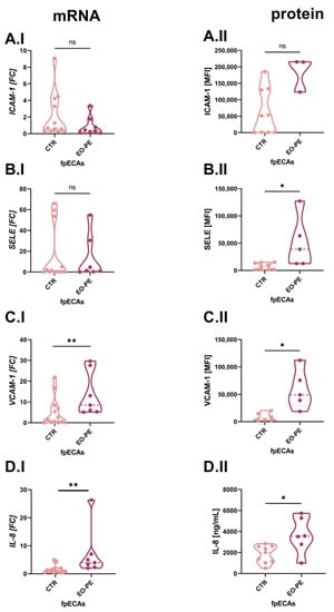Comparison of LAM and IL-8 between CTR and EO-PE fpECAs. No significant difference in ICAM-1 was observed between CTR and EO-PE fpECAs on mRNA (A.I) or protein (A.II) levels. SELE (B.I) mRNA levels were similar between CTR and PE, but the membrane amount of SELE was higher in EO-PE (B.II). VCAM-1 transcription (C.I) was higher in EO-PE compared to CTR fpECAs. The same trend was observed for VCAM-1 membrane amount (C.II). EO-PE fpECAs of IL-8 mRNA were significantly higher (D.I) compared to CTR fpECAs. Moreover, EO-PE fpECAs secreted (D.II) twice the amount of IL-8 compared to CTR fpECAs. Two-tailed unpaired t test with/without Welch’s correction or Mann–Whitney; CTR—N = 9–13; EO-PE—N = 6–7; * p ≤ 0.05; ** p ≤ 0.01; ns, not significant; LAM, leukocyte adhesion molecules; ICAM-1, intercellular adhesion molecule 1; SELE, selectin E; VCAM-1, vascular cell adhesion protein 1; MFI, median fluorescence intensity.