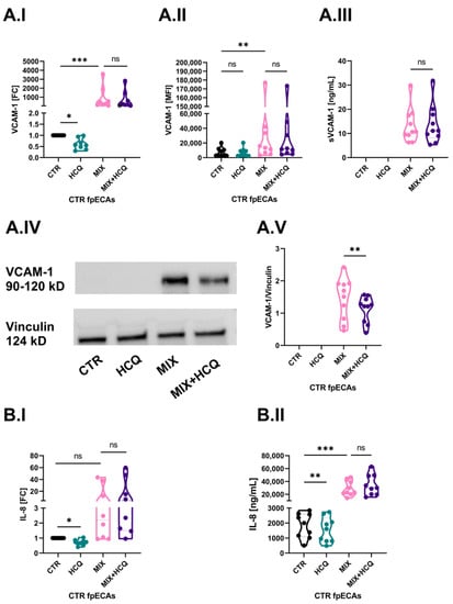 Effect of 1 µg/mL on basal and cytokine-induced levels of VCAM-1 and IL-8. (A) Cytokine mix activated CTR fpECAs by enlarging VCAM-1 mRNA (A.I) and membrane protein levels (A.II) compared to untreated CTR fpECAs. The secretory (A.III) and total protein amount (A.IV) of VCAM-1 measured by ELISA and WB, respectively, were detectable just after MIX challenging. HCQ alone only reduced basal mRNA amount of VCAM-1 (A.I), but it was unable to prevent changes led by MIX when added together. The only exception was the total protein concentration of where the addition of HCQ to MIX led to light weakening of the VCAM-1 signal (A.V). When this signal was quantified relative to the loading control, it was significantly lower compared to MIX challenged cells. Moreover, that decrease was not due to a change in sVCAM-1 secretion (A.III). (B) Changes in mRNA (B.I) and secretion (B.II) levels of IL-8 in CTR fpECAs were determined by RT-qPCR and ELISA. On both levels, basal levels were lower (B.I,B.II) by HCQ and were boosted by cytokine mix (B.II). However, HCQ was unable to prevent changes led by MIX when added together. Statistical significance for multiple comparisons was assessed using either paired RM one-way ANOVA with Sidak’s post hoc test or Friedman test with Dunn’s correction. Paired t test was used for the comparison of two groups. N = 8–10; * p ≤ 0.05; ** p ≤ 0.01; *** p ≤ 0.001; ns, not significant; WB, Western blot.
