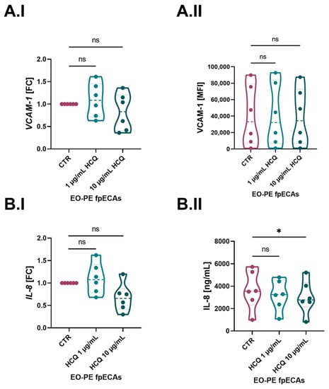 Since EO-PE fpECAs were directly isolated from six preeclamptic placentas, which were under an inflamed state due to the underlying pathology, they were incubated only with HCQ. We detected a difference between CTR and EO-PE fpECAs in VCAM-1 and IL-8; we next tested the mRNA expression of both of them after HCQ treatment. Moreover, membrane presence and secretion of VCAM-1 and IL-8 in HCQ-treated EO-PE fpECAs were measured. Besides a concentration of 1 µg/mL, it was decided to also treat EO-PE fpECAs with 10 µg/mL HCQ. Although 1 µg/mL had an effect on CTR fpECAs IL-8 and VCAM-1 mRNA levels, it did not induce any changes on transcriptional and translational levels of these molecules in EO-PE fpECAs (Figure 6). In addition, the higher concentration of HCQ affected either mRNA (Figure 6A.I) or membrane (Figure 6A.II) amounts of VCAM-1 in EO-PE fpECAs. However, this higher HCQ concentration reduced IL-8 mRNA expression (p ≤ 0.05, Figure 6.BI) while it did not affect IL-8 secretion levels (Figure 6.BII).