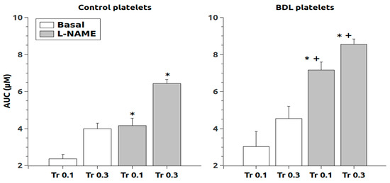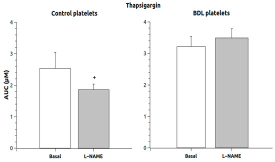 Area under the curve (AUC) of the Ca2+ responses after thrombin administration (0.1 and 0.3 U/mL) in the absence of extracellular Ca2+. Data were obtained in untreated platelets (basal) and after chronic treatment with L-NAME. Results are means + S.E.M. *, p < 0.05 vs. Basal; +, p < 0.05 vs. control.