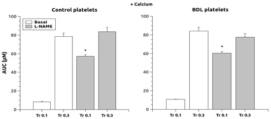 Regarding intracellular Ca2+ release in response to thrombin, chronic L-NAME treatment increased the response after stimulation with thrombin (0.1 and 0.3 U/mL) in the absence of extracellular Ca2+ in both control and BDL rats (Figure 1). The response to thrombin 0.1 was of greater magnitude in the platelets of BDL rats (p < 0.05, 2.4 times vs. 1.8 times in controls) whereas with thrombin 0.3 the elevation was similar in both groups (1.6 times in controls and 1.9 times in BDL). After thrombin stimulation in the presence of calcium (Figure 2), L-NAME elevated the response but only at the dose of 0.1 U/mL (p < 0.05, 6.9 times in controls and 5.7 in BDL). The dose of thrombin 0.3 also elevated calcium levels, but this change was of a lower magnitude (1.1 times in controls and 0.9 in BDL) compared to the lower dose.