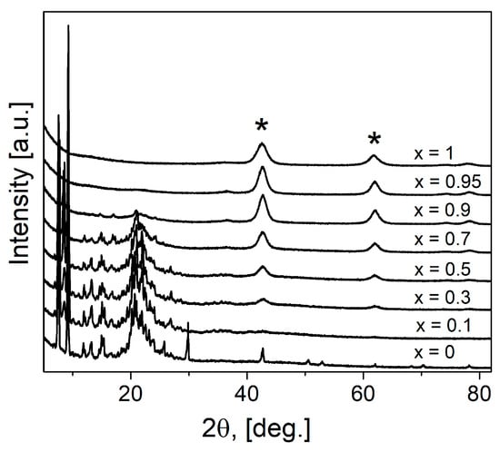 All obtained (1-x)Bu4NBF4–xMgO composites (where x is the molar fraction) were studied by the X-ray diffraction analysis over the 15° < 2θ < 90° angle range (Figure 1). As seen, the reflections belonging to the organic and inorganic phases are strongly separated. In the X-ray diffraction patterns, the reflections relating to MgO (space group Fm3m, PDF 45-946) are marked by the “*” symbol; they are observed for compositions with magnesium oxide concentration x > 0.3. All reflections attributed to MgO are broadened. The grains size (or more correctly, the coherent domains size) of magnesium oxide L as estimated from the Scherrer equation,