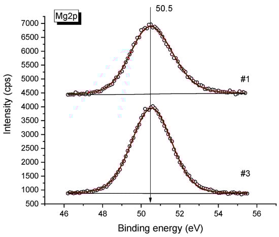 From the analysis of the shape and half-width of the Mg2p spectrum measured for pure MgO and the magnesium oxide in the 0.08Bu4NBF4-0.92MgO samples (Figure 3), it may be concluded that in both samples the binding energy of the Mg2p line of about 50.5 eV, which is characteristic of Mg2+ in the MgO oxide [,].