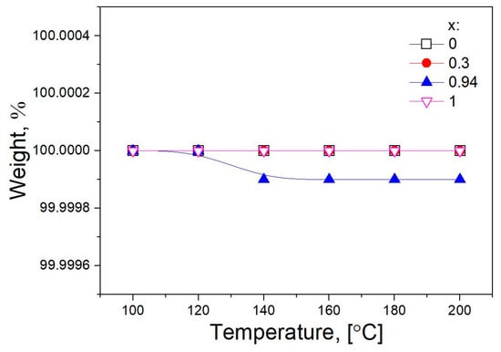 Before experiments, the study of the weight loss of the composite was carried out in real time using a McBain balance. The samples were heated in an argon flow at temperatures of 100, 120, 140, 160, 180, and 200 °C for 10 min at each temperature. The total flow rate of argon is 10 l/h. The change in the mass of the sample was monitored using a cathetometer. At the end of the experiment, the reactor was cooled to room temperature in an argon flow. As seen from Figure 4, heating the samples up to 200 °C does not accompany by a weight loss within the 0.01 weight percent. Therefore, the samples under study are stable in conditions of further experiments.