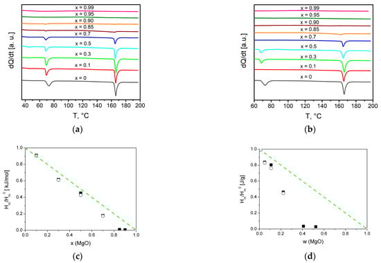 DSC curves for composites (1-x)Bu4NBF4–xMgO obtained on the first (a) and second (b) heating. Experimental values of the relative change in the heat effect due to melting of tetrabutylammonium tetrafluoroborate (squares—1 heating, circles—2 heating) in comparison with the dependences expected for random mixture of the components (lines) for molar (c) and weight (d) fraction of MgO.