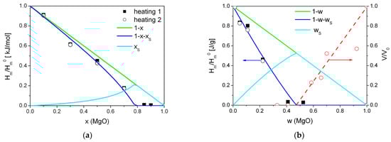 The deviation of experimental data from linear dependences Hm/Hm0 [kJ/mole] = 1 − x and Hm/Hm0 [J/g] = 1 − w may be explained by the presence of an interface-stabilized amorphous phase which does not give diffraction pattern (as seen from Figure 1) and has diffused melting point. The dependences of the normalized melting enthalpy on the concentration of the MgO additive may be qualitatively described in terms of the model proposed earlier [,,]. Assuming that the volume fraction of the MgO in the composite is equal to f and an amorphous layer of the salt with the thickness of λ exists on the surface of MgO, the volume fraction of the amorphous interface fS phase for random distribution of the components may be estimated as: