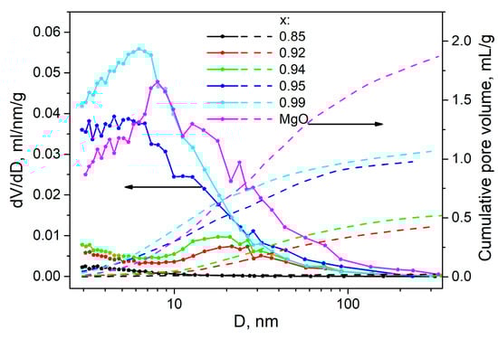 The increase in the concentration of the salt leads to a monotonical decrease in the total cumulative pore volume from the value of 1.87 cm3/g for pure MgO to zero for the sample with x = 0.85. It allows one to plot the dependence of relative porosity (normalized to the total pore volume of MgO) on the concentration in the composites under study. Such dependence is represented in Figure 6b as a function of the weight fraction of the oxide.