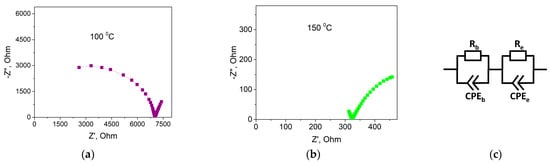 In the impedance plots, there are two oblate semicircles corresponding to the bulk impedance at high frequencies and the electrode impedance at low frequencies. To calculate the impedance parameters, we chose optimal equivalent electrical circuit presented in Figure 8c. The circuit comprised the bulk impedance including the active resistance Rb and the constant phase element CPEb and the electrode impedance including the charge transfer resistance Re and the constant phase element CPEe. From the analysis of the Nyquist plots, the values of the resistance Rb and the conductivity σ = Rb−1·d·S−1 (where d is the pellet thickness; S is the electrode surface area) were calculated for each temperature and the temperature dependences of conductivity were plotted.