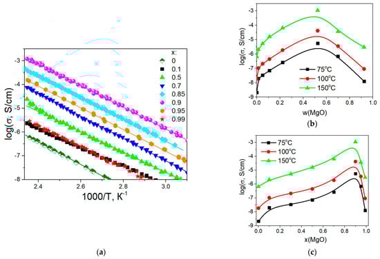 Temperature dependences of conductivity for the composites (1-x)Bu4NBF4–xMgO (0 ≤ x < 1) are presented in Figure 9a. The conductivity monotonically increases with the temperature and is well reproducible in the heating–cooling cycles. Conductivity values obey the Arrhenius law σ = (A/T)·exp (Ea/RT), where A is the pre-exponential factor and Ea is the activation energy. The calculated conductivity parameters Ea and log(A) are shown in Table 2. Figure 9b,c shows the dependence of the conductivity of the composites on weight and molar fractions of MgO at temperatures of 75, 100, and 150 °C.