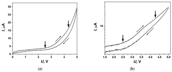 In order to understand the reason for such discrepancy, the CVA curve was represented in Tafel coordinates log(I) vs. U, such a plot is shown in Figure 10b. From this plot, it is clearly seen that two electrochemical processes take place in the cell: the first process at the voltage of 2.5 V, whereas the second one starts at the voltage range of 4–4.5 V. When analyzing the data in a linear scale it is difficult to observe the second process and determine its characteristic voltage. The Tafel plot allows one, at least roughly, to separate both processes. The electrochemical process taking place at 2.5 V may be explained by the electrolysis of OH groups on the MgO surface. Though typical voltage values for such processes should be below 2 V, this value can be shifted due to the electrode polarization. Another reason of this process is the electrochemical decomposition of BF4−xOHx− anions which may be formed as a result of partial hydrolysis of BF4− anions in the vicinity of partially hydrated MgO surface. The concentration of the OH groups on the surface of MgO seems to be higher than on Al2O3 surfaces leading to much stronger influence of the electrochemical process at 2.5 V in Bu4NBF4–MgO compared to Bu4NBF4–Al2O3 ones provided that the decomposition voltage of the Bu4NBF4 salt remains equal to nearly 4–4.5 V in both the composites.