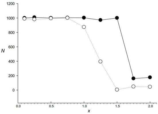 The number of repeats in the groups created for the E. coli genome. Black circles on a continuous curve indicate the groups for the escherichia_coli_str_k_12_substr_mg1655_gca_000005845 genome; white circles indicate the size of the groups created for the same genome, in which the codons in coding sequences are mixed randomly; black circles on a discontinuous curve indicate the size of the groups created for a random sequence of the same length as the escherichia_coli_str_k_12_substr_mg1655_gca_000005845 genome. N is the number of repeats identified.