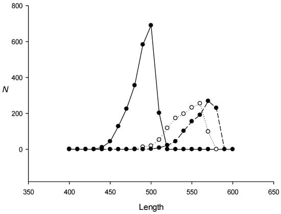 Length distribution of dispersed repeats found in the escherichia_coli_str_k_12_substr_mg1655_gca_000005845 genome. Repeats of families 1, 2, and 3 are indicated by black circles on a continuous line, white circles, and black circles on a discontinuous line, respectively.