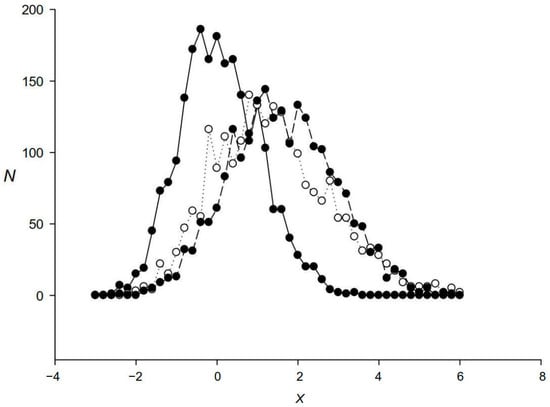Distribution of the dispersed repeats from the first group according to the level of triplet periodicity. Here, X is the argument of normal distribution indicating the level of statistical significance of triplet periodicity. Black circles on a continuous line show triplet periodicity calculated for randomly mixed sequences from the first group; white circles show triplet periodicity for the first group sequences found in the escherichia_coli_str_k_12_substr_mg1655_gca_000005845 genome without alignment with the PWM for this family (sequences without indels as they are in the genome); black circles on a dashed line show the level of triplet periodicity in the sequences that are a part of the alignments with the first group PWM (sequences with indels).