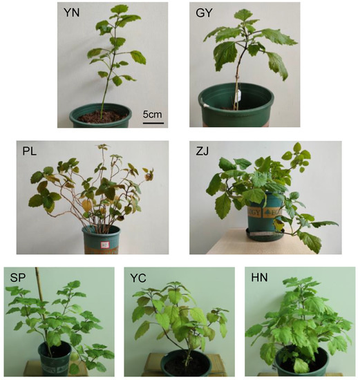 A total of seven patchouli accessions from different localities were collected for this study. Among them, there are four accessions from different planting regions in Guangdong province (ZJ, YC, GY, SP), one accession from the main planting region of Hainan province (HN), and two accessions from Southeast Asia (PL, YN) (Figure 1).