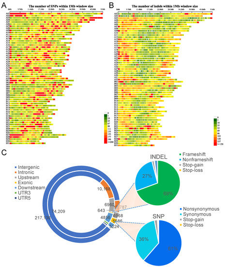 Distribution and annotation for SNPs and INDELs. (A,B) Density distribution of all SNPs (A) and INDELs (B) on chromosomes; (C) Genome annotation and functional annotation of SNPs and INDELs. The left doughnut diagram is the result of the genome annotation, the outer circle is the SNP, and the inner circle is INDEL. The right pie chart is the functional annotation for INDEL (top) and SNP (bottom).