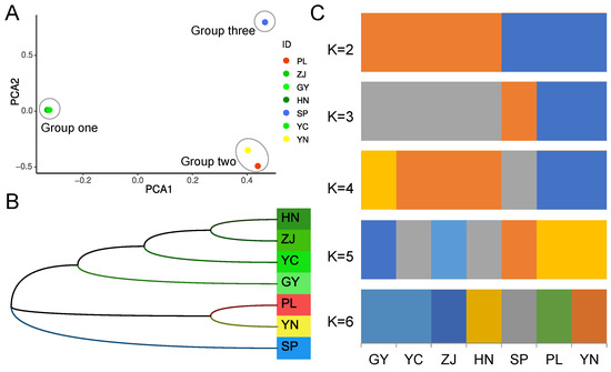 Phylogenetic relationship analysis. (A) Principal component analysis on seven patchouli accessions. (B) Neighbor-joining phylogenetic tree-based analysis on all high-quality SNPs. (C) Population structure analysis of patchouli from different sources using FRAPPE.
