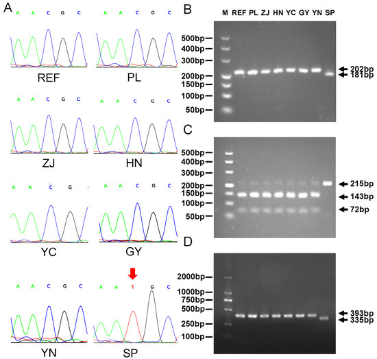 Verification of SP specific molecular markers. (A) Sanger sequencing verification for SNP mutation of A24-2156111. The arrow is the location of the SNP location. (B,C) Enzymatic digestion verification for SNP of A07-9038661 (B) and B23-13365305 (C). (D) PCR directly amplifies the sequence for INDEL mutation of A01-27218088; REF represents the sequence of reference patchouli genome.