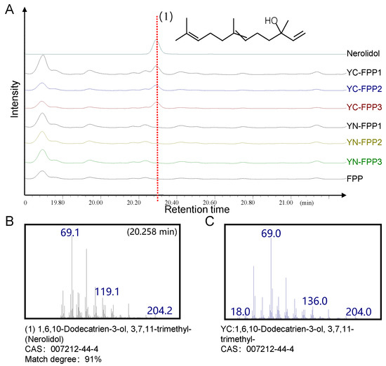 Based on the detection of variants in Pat_B23G065900 (Table S2), patchouli accessions from Southeast Asia (PL, YN) and SP shared the same mutations, while the Chinese accessions did not show any mutations (Supplementary Figure S8). To investigate the impact of mutations on gene function, we employed in vitro enzyme activation to assess the effect of mutations on Pat_B23G065900, using YC and YN as reference and mutation models. After cloning, the coding sequences of Pat_B23G065900 in both accessions, expressing the proteins they encoded in E. coli, were purified. We subsequently used FPP as the substrate and purified protein as the catalyst to conduct an in vitro enzymatic reaction. The products were detected using Gas Chromatography-Mass Spectrometry (GC-MS). A chromatographic peak appeared in YC at 20.258 min, while nothing was detected in YN (Figure 5A). The retention time of this peak was consistent with the chromatographic peak retention time of the standard nerolidol, and their match degree was 91% (Figure 5B,C). The enzymatic reaction product of Pat_B23G065900 is nerolidol, indicating that the gene is a nerolidol synthase gene (PatNES). These results indicate that genetic variations in PatNES among the patchouli accessions in Southeast Asia and SP inactivate its nerolidol synthetase function. This may lead to a diversity of downstream metabolites of nerolidol among patchouli accessions.