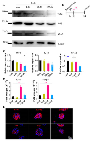 RvD1 demonstrates significant anti-inflammatory properties under in vitro conditions. (A) Western blot analysis confirmed the expression of pro-inflammatory cytokines (TNF-α, IL-1β, and NF-κB) in response to RvD1 treatment at concentrations of 0 nM, 1 nM, 10 nM, and 100 nM (n = 2). (B) Schematic diagram of experiments. (C) Quantitative data from Western blot. Expression level is normalized with the 0 nM group. (D) The expression of the anti-inflammatory cytokines IL-10 and TGF-β, as assessed by qRT-PCR, following RvD1 treatment at concentrations of 0 nM, 1 nM, 10 nM, and 100 nM. (E) Spheroid PNSCs expressed markers for committed glial cells (GFAP, S100β and GAP43) and neuronal cells (neurofilament; NF, Tuj-1, and MAP2). Blue means DAPI. * p < 0.05, ** p < 0.01, and *** p < 0.001.