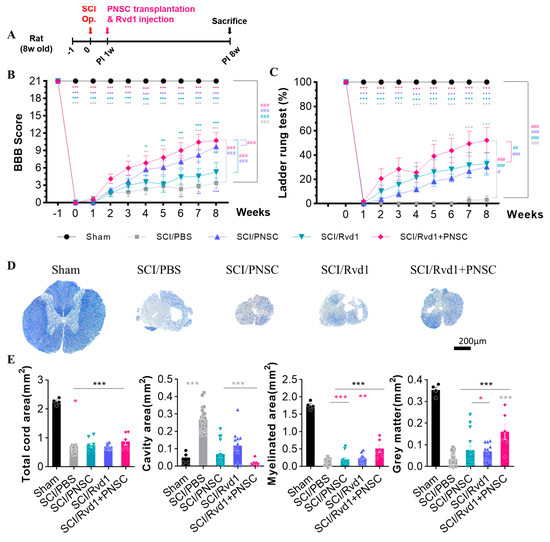 Functional restoration and tissue regeneration following combined therapy (A) Schematic diagram of experiments. (B) BBB scores post-SCI for all groups (sham, SCI/PBS, SCI/RvD1, SCI/PNSC, SCI/RvD1+PNSC), from 1 week pre-injury to 8 weeks post-injury. (C) Ladder rung test results post-SCI for all groups from the day of injury to 8 weeks later. (D) Eriochrome cyanine–cresyl violet staining of spinal cord cross-sections for myelin in all groups (sham, n = 3; SCI/PBS, n = 4; SCI/RvD1, n = 6; SCI/PNSC, n = 6; and SCI/RvD1+PNSC, n = 6) for the assessment of tissue regeneration at 4 and 8 weeks post-SCI. (E) Evaluation of total cord area, cavity area, myelinated area, and gray matter area from eriochrome cyanine staining across all groups. All data were processed using two-way analysis of variance with Tukey’s multiple comparisons test. The p-values are indicated as follows: * p < 0.05, ** p < 0.01, and *** p < 0.001 And analysis by linear mixed effects model is expressed to # p < 0.05, ## p < 0.01, and ### p < 0.001.