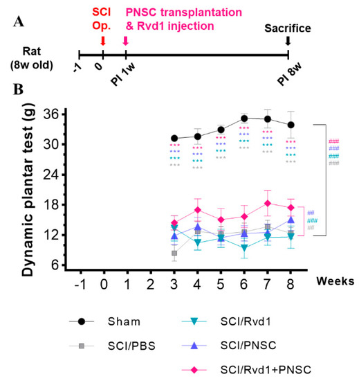 Pain mitigation through combined therapy. (A) Schematic diagram of experiments. (B) Mechanical allodynia was evaluated using the dynamic plantar test. Testing began 3 weeks after SCI and continued until the 8-week mark. All data were statistically processed using two-way analysis of variance coupled with Tukey’s multiple comparisons test. Multiple comparisons results expressed by *** p < 0.001. And analysis by linear mixed effects model is expressed to ## p < 0.01, and ### p < 0.001.