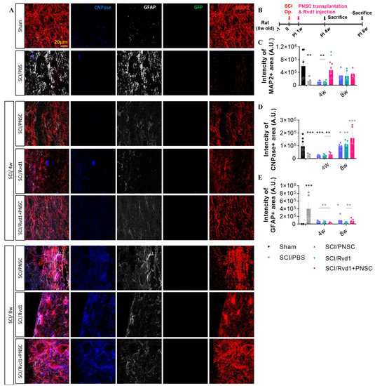 Outcomes of in vivo immunohistochemical analysis. (A) Representative images depict staining for CNPase (blue), GFAP (gray), GFP (green), and MAP2 (red) at 4 and 8 weeks following SCI. (B) Schematic diagram of experiments. (C) Aggregate MAP2 intensity across all study groups (sham, n = 5; SCI/PBS, n = 10; SCI/RvD1, n = 20; SCI/PNSC, n = 20; and SCI/RvD1+PNSC, n = 20). Analysis was conducted using ordinary one-way ANOVA with Tukey’s multiple comparisons test. (D) Overall intensity of CNPase staining across all groups (sham, n = 5; SCI/PBS, n = 10; SCI/RvD1, n = 20; SCI/PNSC, n = 20; and SCI/RvD1+PNSC, n = 20). (E) Total intensity of GFAP staining across all groups (sham, n = 5; SCI/PBS, n = 10; SCI/RvD1, n = 20; SCI/PNSC, n = 20; and SCI/RvD1+PNSC, n = 20). Analysis was conducted using ordinary one-way ANOVA with Tukey’s multiple comparisons test. All data are presented as the mean ± the standard error of the mean; * p < 0.05, ** p < 0.01, and *** p < 0.001.