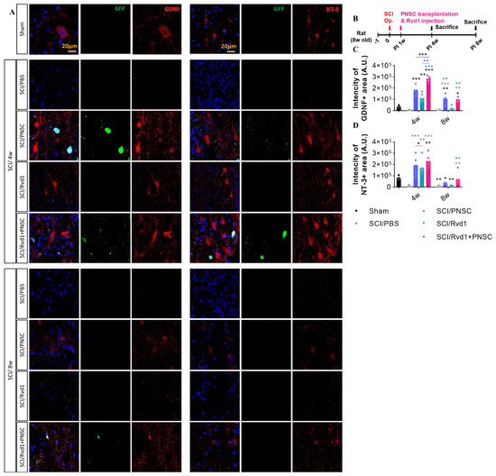 Furthermore, our previous report provided evidence of the expression of various neurotrophic factors, including BDNF, GDNF, IGF, IL-6, NGF, and NT-3, in PNSCs. Notably, we observed increased expression of GDNF and NT-3 in spheroid forms of PNSCs, suggesting that PNSC spheroids have a prolonged and heightened influence on their expression, particularly in the context of SCI. This current study aimed to verify the impact of Rvd1 on the expression of GDNF and NT-3 by PNSC spheroids. Our results indicated a significant increase in the expression of GDNF and NT-3 in all groups, including PNSC spheroids, Rvd1, and Rvd1 combined with PNSC spheroid transplants, at 3 weeks post-transplantation (4 weeks after injury) (Figure 6A–D). Notably, the group receiving Rvd1 and PNSC co-transplantation demonstrated the most substantial increase in GDNF expression compared to the other groups. Furthermore, our previous study already demonstrated the ability of PNSC spheroids to maintain the secretion of neurotrophic factors for a more prolonged period compared to single cells. Confirming these findings, our current study demonstrated that Rvd1 contributes to extended secretion of GDNF and NT-3 compared to the group transplanted with PNSC spheroids alone, with a notable emphasis on the sustained effect on NT-3 at 8 weeks after injury.