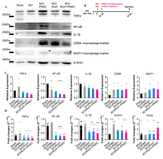 Demonstration of RvD1’s potent anti-inflammatory action in vivo. (A) The production of pro-inflammatory cytokines (TNF-a, NF-κβ, IL-1β, and the macrophage markers CD68 and MCP1) was analyzed in all groups (sham, n = 2; SCI/PBS, n = 2; SCI/RvD1, n = 2; SCI/PNSC, n = 2; and SCI/RvD1+PNSC, n = 2) using Western blotting. (B) Schematic diagram of experiments. (C) Quantitative analysis of Western blot. All data are normalized with the sham group. (D) The SCI/RvD1+PNSC group displayed the highest expression of the anti-inflammatory cytokine TGF-β, as determined by qRT-PCR. In contrast, significantly greater expression of pro-inflammatory cytokines (NF-κB, IL-1β, STAT3 and TNF-α) was observed in the SCI/PBS group compared to the three other groups. Data were analyzed using one-way ANOVA. Multiple comparisons results expressed by * p < 0.05; ** p < 0.01; *** p < 0.001.