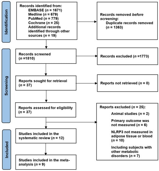 Medline (Ovid); EMBASE (Ovid); CENTRAL (www.thecochranelibrary.com) accessed on 20 October 2022; PubMed; Clinicaltrials.gov; the EU Clinical Trials Register; and the World Health Organisation International Clinical Trials Register were systematically searched starting from 1946 to October 2022 for pertinent studies. A combination of the following search terms was used: (“overweight”[MeSH Terms] or obesity or overweight or over-weight) AND ((“inflammasomes”[MeSH Terms]) OR inflammasomes OR (“nlr family, pyrin domain containing 3 protein”[MeSH Terms]) OR “NLR family pyrin domain containing 3” OR nlrp3 OR (“caspase 1”[MeSH Terms]) OR “Interleukin-1 beta converting enzyme” OR caspase-1 OR “Apoptosis-associated speck-like protein containing a CARD” OR PYCARD).