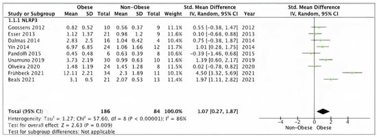 Our meta-analysis provides further evidence for the upregulation of the NLRP3 inflammasome and its related components in obese and PCOS individuals, which is indicative of a possible role of this inflammasome in obesity and PCOS-related chronic inflammation. However, given the limited number, small sample sizes, and heterogeneity of the reviewed studies, further research is required to elucidate the role of NLRP3 in obesity.