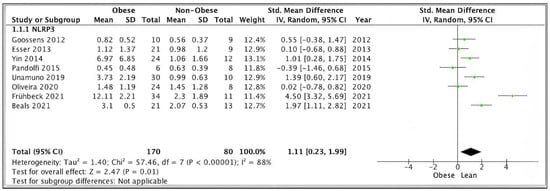 The role of NLRP3 in obesity-related inflammation has previously been investigated in several studies with conflicting results. While some studies reported increased NLRP3 levels in obese versus lean subjects [35,36], others showed no differences between the two groups [28,37]. Although the role of NLRP3 in obesity has previously been investigated in a systematic review published in 2017 by Rheinheimer et al., the majority of the included papers were animal studies. Furthermore, many of the human studies in this review mainly focused on metabolically unhealthy obese (MUO) participants, making it difficult to draw any firm conclusion [38]. Moreover, since the previous systematic review, many recent human studies assessing the role of NLRP3 in obese individuals have been published.