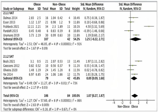 Of the six studies (n = 157) measuring NLRP3 gene expression in VAT, three (n = 105) showed significantly increased NLRP3 levels in obese versus non-obese controls [45,49,50], and three (n = 52) showed no significant difference between the groups [28,37,46].