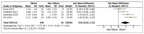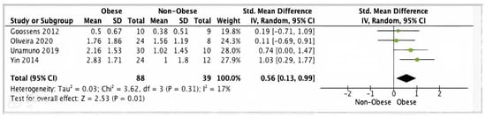 An appropriate selection of participants was used in all studies, which met our inclusion criteria. All participants were in the age range between 33 and 63 years, had no metabolic or endocrinological diseases, and were not on any medication that might affect inflammatory status. In most studies, the ages of the obese and non-obese participants were comparable, apart from two studies where there was a difference > 10 years in mean/median age between the two groups [44,45]; both studies scored low on the comparability assessment. Participants were weighed after an overnight fast and samples were taken in the morning to ensure comparability.