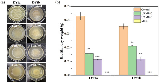 Effects of linalool on pellicle biofilm formation (a) and yield (b) of B. amyloliquefaciens DY1a and DY1b. The lowercase letters indicate that there were significant differences between the control and experimental groups. One-way ANOVA followed by Dunnett’s multiple comparison post hoc test was carried out to determine statistical significance between each treatment and the negative control of the same strain; ** p < 0.01, *** p < 0.001.